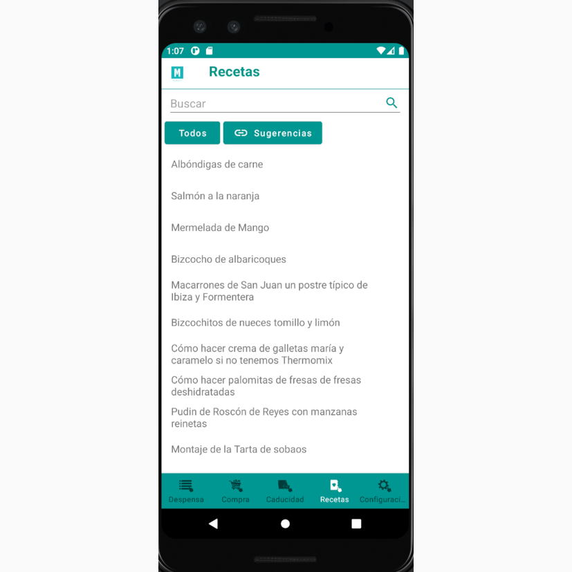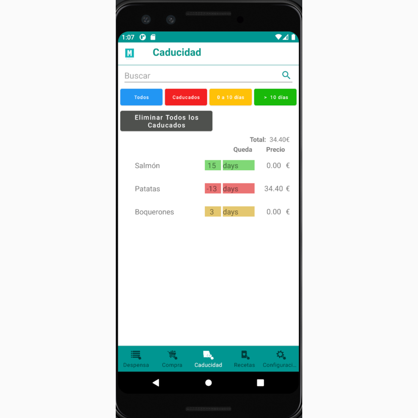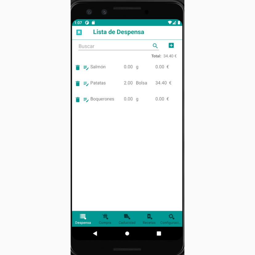 Se trata de una app movil realizada en el TFG en la que se puede llevar el control de los alimentos para que no caduquen, realizar listas de compra, ver recetas, que te sugiera recetas según los alimentos que dispongas, etc. La aplicación mediante la camara del móvil lee el código de barras del alimento y se encarga de llenar los datos característicos. También podemos cambiar el idioma y el tipo de moneda.